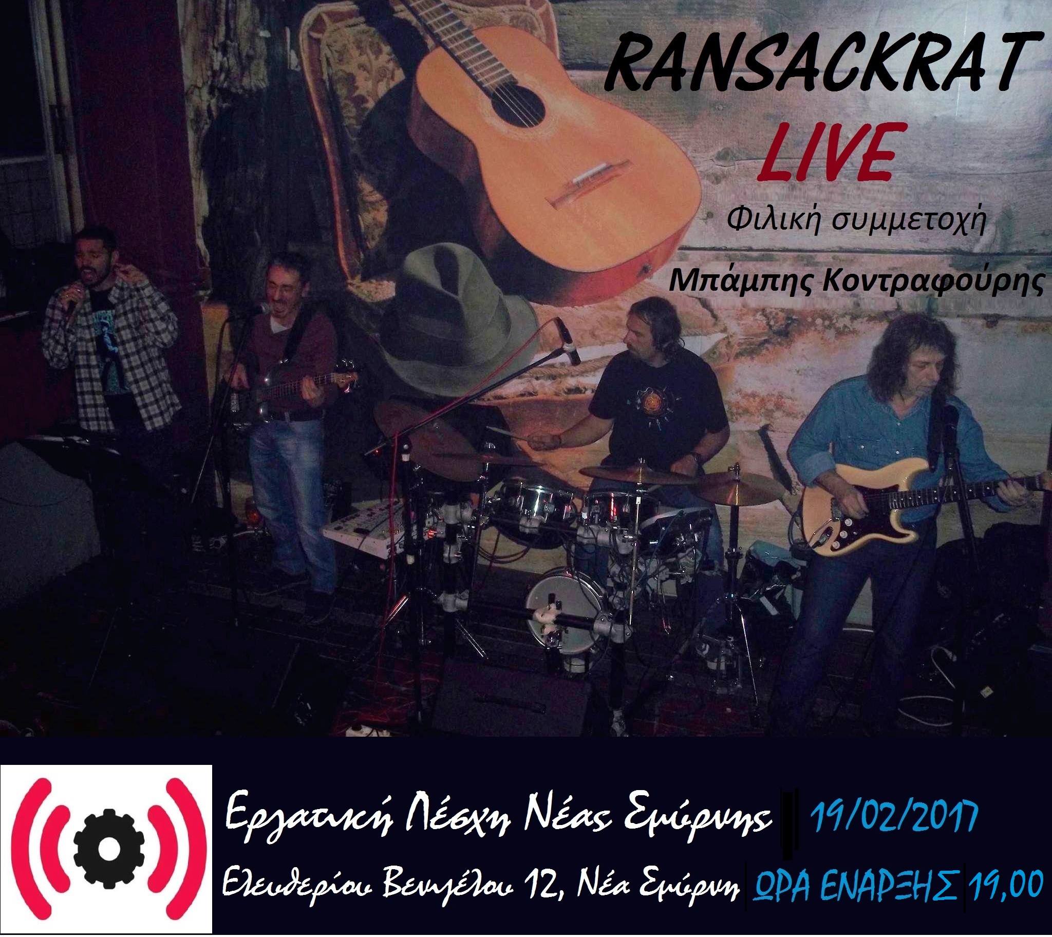Την ΚΥΡΙΑΚΗ 19/02/2017 στις 19.00μμ το μεγάλο LIVE των RANSACKRAT για το 2017 στην ΕΡΓΑΤΙΚΗ ΛΕΣΧΗ ΝΕΑΣ ΣΜΥΡΝΗΣ. Μια ROCK μπάντα που εδώ και 30 χρόνια συνεχίζει να εντυπωσιάζει με τις live εμφανίσεις της!!!