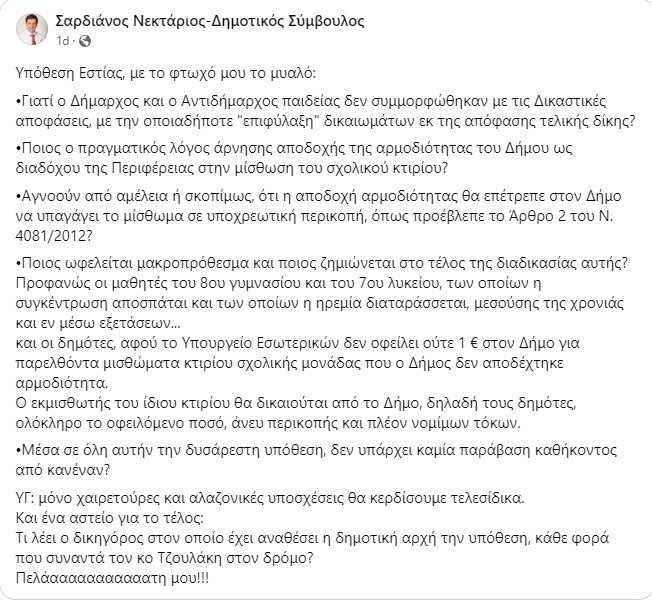 Σαρδιάνος Νεκτάριος-Δημοτικός Σύμβουλος: Υπόθεση Εστίας, με το φτωχό μου το μυαλό