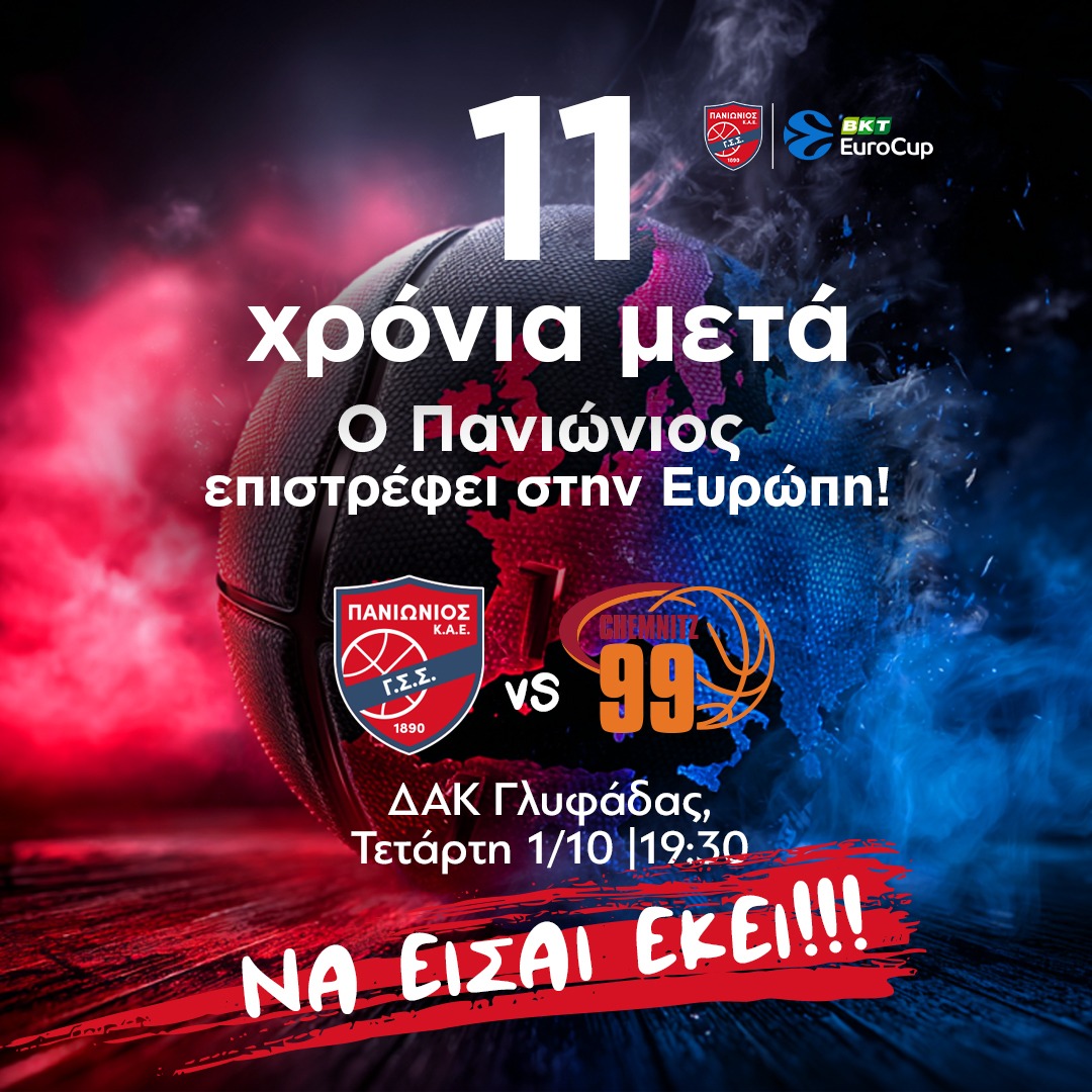 "Ζήσε κι εσύ θέση στην ιστορική πρεμιέρα του της ΚΑΕ ΠΑΝΙΩΝΙΟΣ στο BKT Eurocup της περιόδου 2025-2026, κόντρα στην γερμανική ομάδα Niners Chemnitz, την Τετάρτη 1 Οκτωβρίου και ώρα 19:30.