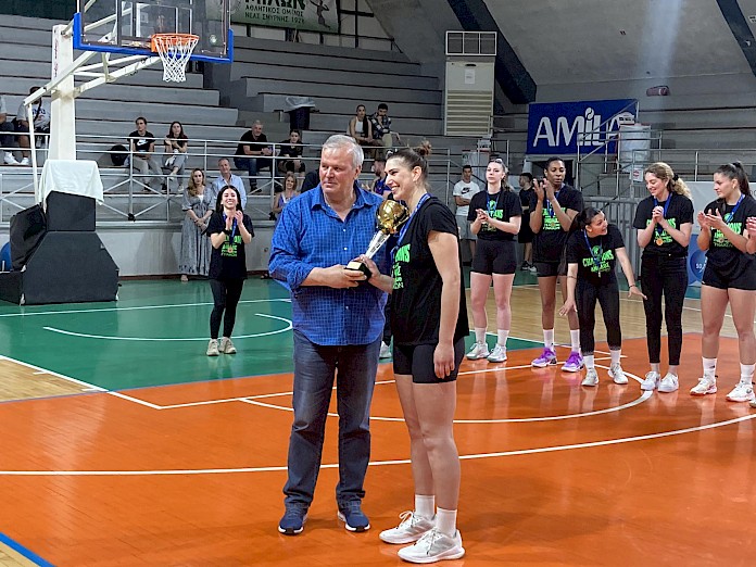 Ο πρόεδρος της ΕΣΠΕΔΑ, Νεκτάριος Χαλβατζής, απονέμει το κύπελλο στην αρχηγό του Μίλωνα, Μαρία Θεοδωρακέα