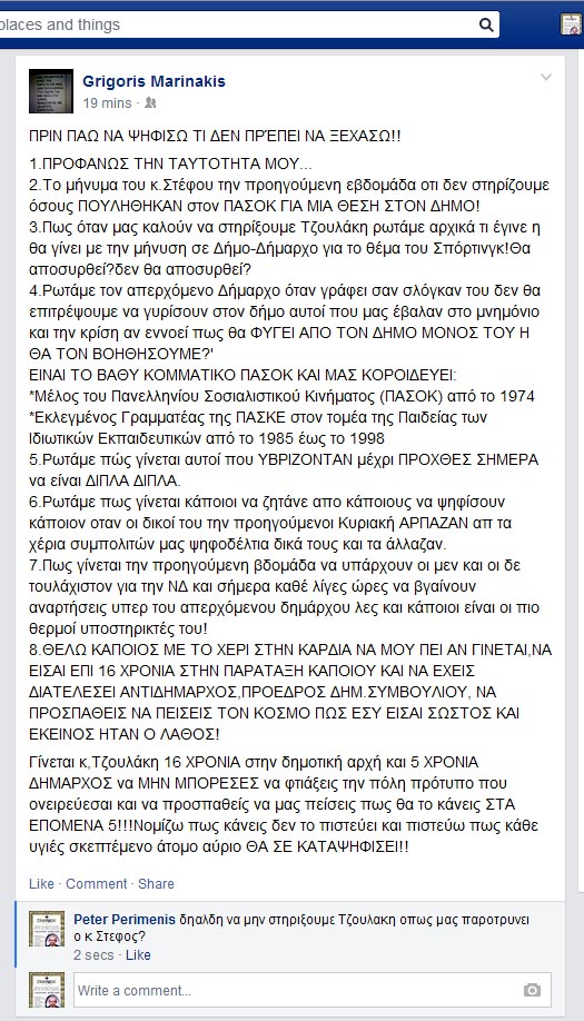 ΥΓ : Αραγε ο Δήμαρχος Τζουλάκης, την χρειάζεται αυτή την στήριξη ?