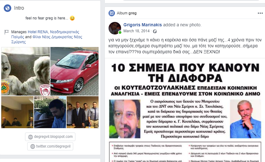 Το 2010 συντάσσομαι με τον συνδυασμό «Νέα Σμύρνη -Νέα Σελίδα» του κ.Στάθη Κούπα ,ο οποίος είχε την στήριξη της Νέας Δημοκρατίας ,ως υποψήφιος δημοτικούς σύμβουλος και πάλι σε αντίθεση με άλλα άτομα τα οποία διεκδικούν σήμερα της ψήφο των Νεοσμυρνιωτών ως υποψήφιοι δημοτικοί σύμβουλοι αυτοαποκαλούμενοι ως οι γνήσιοι Νεοδημοκράτες.........''