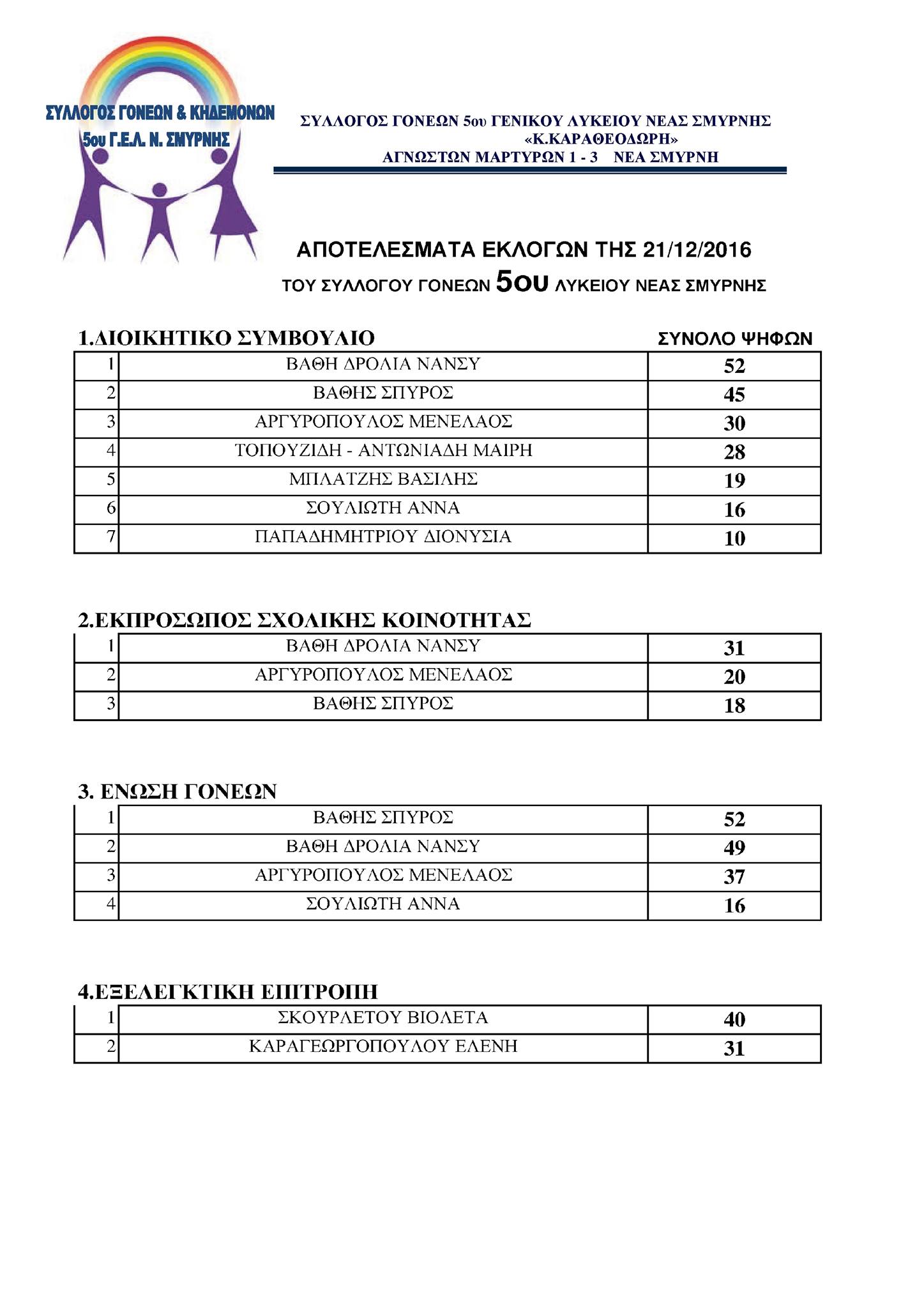 Αναμένονται οι εσωτερικές διαδικασίες για την εκλογή ΔΣ. Καλή επιτυχία στους καλούς και ενεργούς πολίτες και φίλους αλλά και σε ολους όσους θα βοηθήσουν τον Σύλλογο Γονέων του 5ου Λυκείου της Νέας Σμύρνης