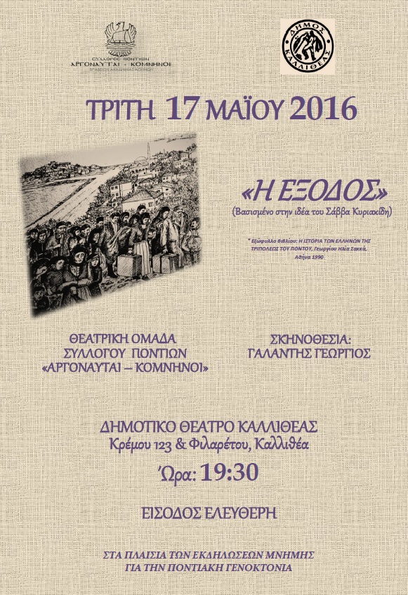 Στις 17 Μαιου στο Δημοτικό Θέατρο Καλλιθέας στις 19.30 και στις 20 Μαίου στην Θεατρική Σκηνή ''Κάρολος Κουν '' στον Αλιμο παρουσιάζεται από την θεατρική ομάδα του Συλλόγου Ποντίων Καλλιθέας ''Αργοναύται Κομνηνοί'' το θεατρικό έργο ''Η Εξοδος''