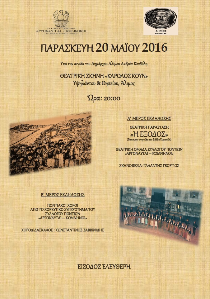 Στις 17 Μαιου στο Δημοτικό Θέατρο Καλλιθέας στις 19.30 και στις 20 Μαίου στην Θεατρική Σκηνή ''Κάρολος Κουν '' στον Αλιμο παρουσιάζεται από την θεατρική ομάδα του Συλλόγου Ποντίων Καλλιθέας ''Αργοναύται Κομνηνοί'' το θεατρικό έργο ''Η Εξοδος''