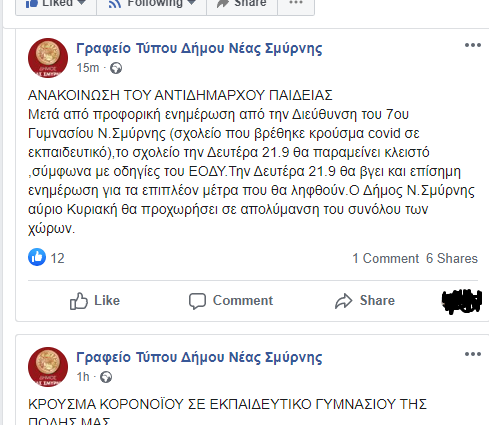 ''Μετά από προφορική ενημέρωση από την Διεύθυνση του 7ου Γυμνασίου Ν.Σμύρνης (σχολείο που βρέθηκε κρούσμα covid σε εκπαιδευτικό),το σχολείο την Δευτέρα 21.9 θα παραμείνει κλειστό ,σύμφωνα με οδηγίες του ΕΟΔΥ.Την Δευτέρα 21.9 θα βγει και επίσημη ενημέρωση για τα επιπλέον μέτρα που θα ληφθούν.Ο Δήμος Ν.Σμύρνης αύριο Κυριακή θα προχωρήσει σε απολύμανση του συνόλου των χώρων.''