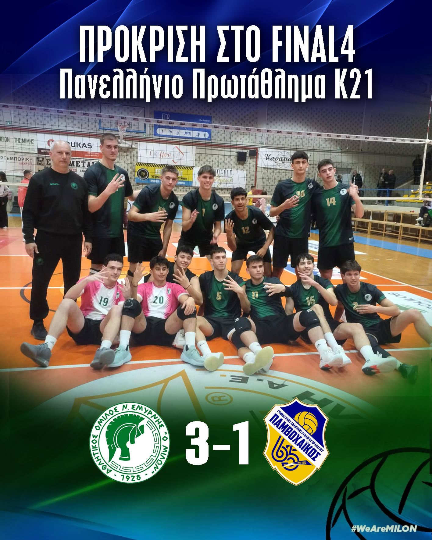 Τη συμμετοχή τους στις τέσσερις καλύτερες ομάδες της Ελλάδος για ακόμη μια φορά εξασφάλισαν οι Έφηβοι του Μίλωνα στο βόλεϊ, οι οποίοι κέρδισαν με 3-1 τον Παμβοχαϊκό στην ημιτελική φάση Γ' και Δ' ομίλου (18-25, 25-20, 25-17, 25-19).