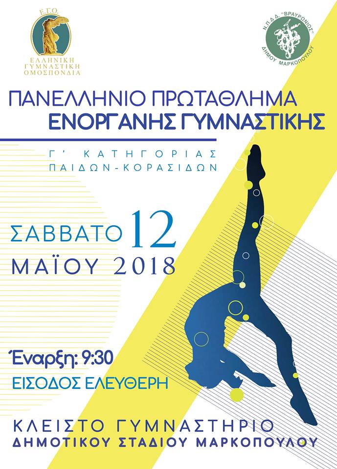 Το Σάββατο, 12 Μαΐου 2018, το Μαρκόπουλο θα φιλοξενήσει το Πανελλήνιο Πρωτάθλημα Ενόργανης Γυμναστικής Γ’ Κατηγορίας (Παίδων-Κορασίδων) που διοργανώνει η Ελληνική Γυμναστική Ομοσπονδία.
