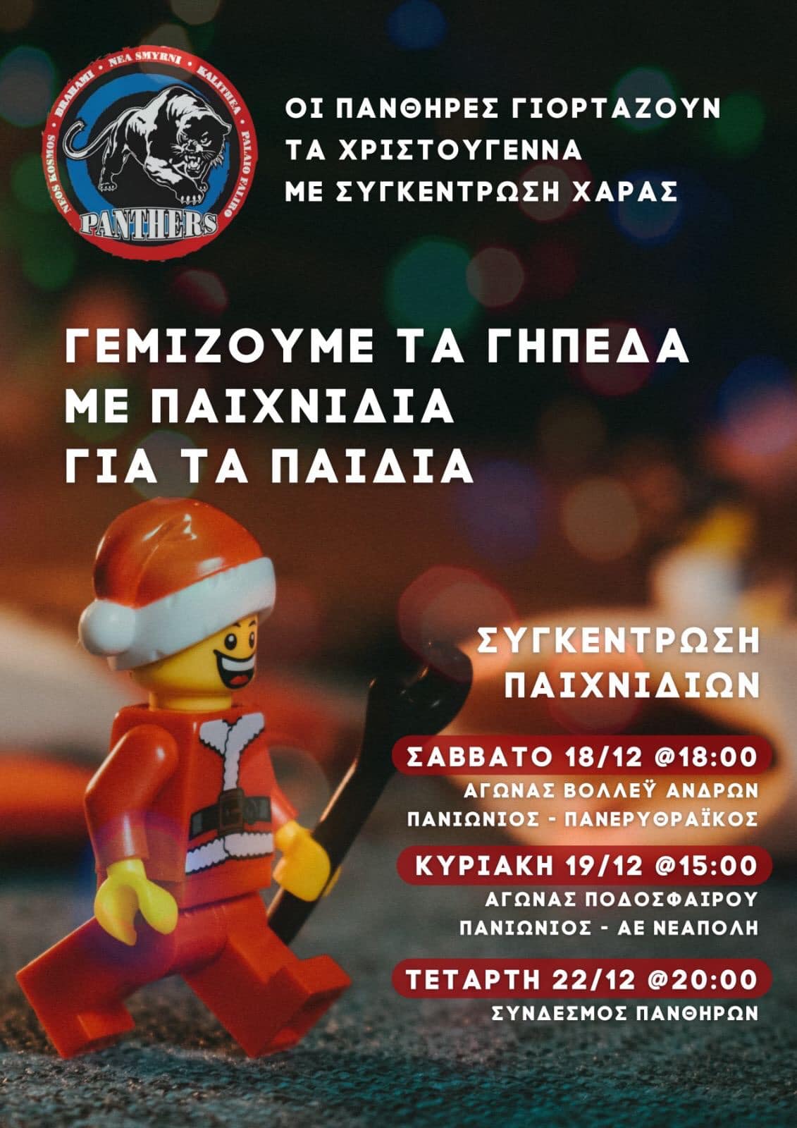 Έτσι λοιπόν, καλούν τον κόσμο να φέρει μαζί του είτε παλιά είτε καινούρια παιχνίδια, τα οποία θα δώσουν μεγάλη χαρά σε πολλά παιδιά αυτές τις γιορτινές μέρες. Η συγκέντρωση των παιχνιδιών θα γίνει πριν από τον αγώνα βόλεϊ του Σαββάτου (18/12, 18:00), πριν από το παιχνίδι της ποδοσφαιρικής ομάδας την Κυριακή (19/12, 13:00-15:00) αλλά και την Τετάρτη (22/12, 20:00-22:00) στον Σύνδεσμο των Πανθήρων.