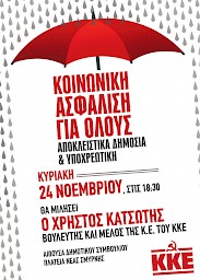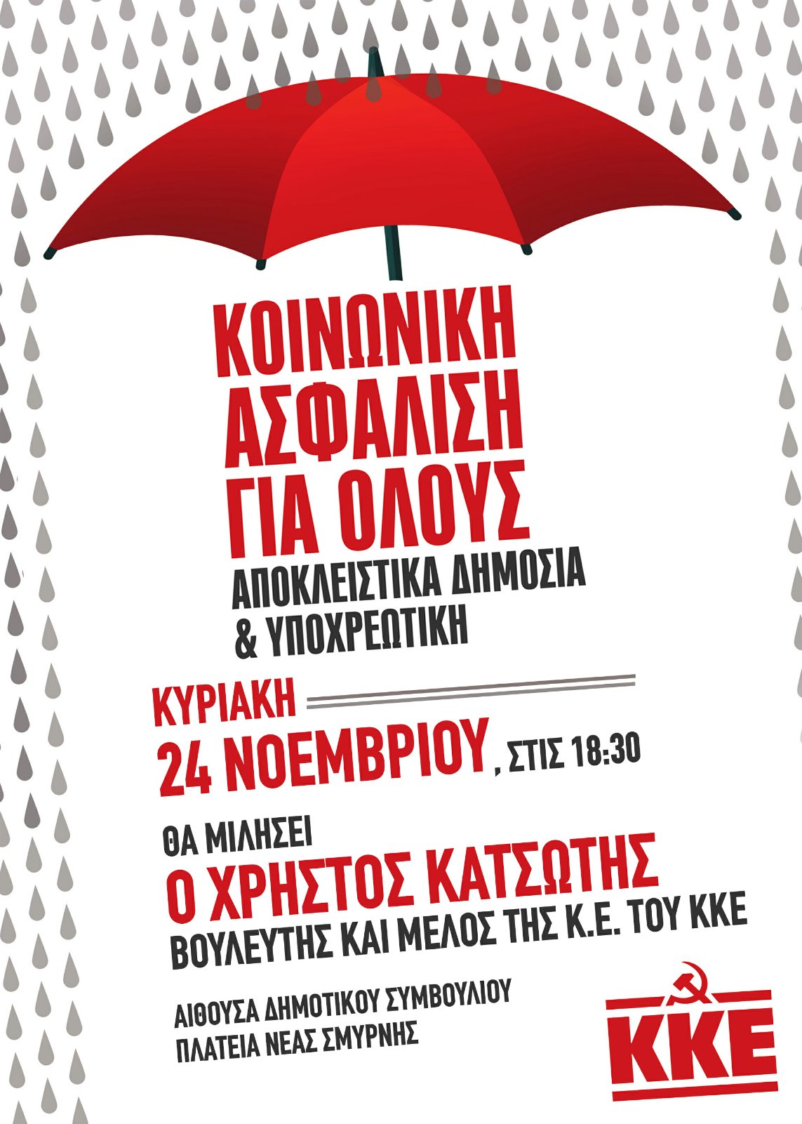 Ο Χρήστος Κατσώτηςτόνισε ότι στον αντίποδα όλων αυτών βρίσκεται η θέση του ΚΚΕ. Το ΚΚΕ αγωνίζεταιγια δημόσια , καθολική , υποχρεωτική κοινωνική ασφάλιση, για την οικοδόμηση ενιαίου συστήματος κοινωνικής ασφάλισης που περιλαμβάνει τα συνταξιοδοτικά δικαιώματα , τις υπηρεσίες πρόληψης και αποκατάστασης της υγείας ,τις παροχές και υπηρεσίες κοινωνικής πρόνοιας. Έκλεισε την ομιλία του καλώντας σε ενωτικό αγώνα εργαζομένων και των άλλων λαϊκών στρωμάτων για την υπεράσπιση της κοινωνικής ασφάλισης με πρώτο σταθμό το στις 10.30 στα Προπύλαια.μεγάλο συλλαλητήριο το Σάββατο 30 Νοέμβρη