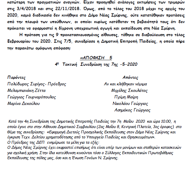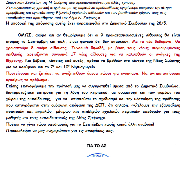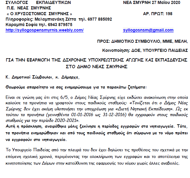 Εγγραφο του Συλλόγου Εκπαιδευτικών Πρωτοβάθμιας Εκπαίδευσης Ν.Σμύρνη προς τον Δήμαρχο Τζουλάκη και Δημοτικό Συμβούλιο !