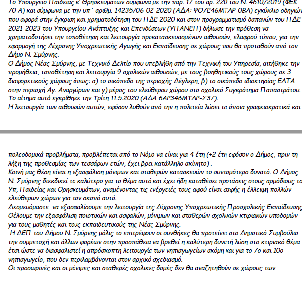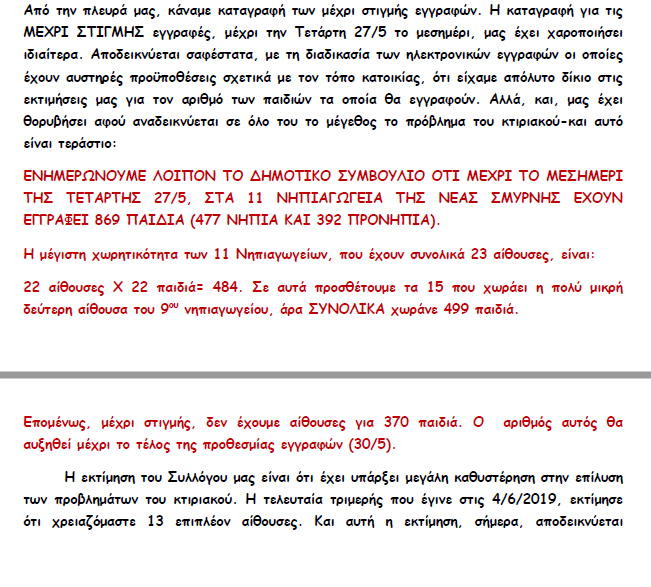 ''ΕΝΗΜΕΡΩΝΟΥΜΕ ΛΟΙΠΟΝ ΤΟ ΔΗΜΟΤΙΚΟ ΣΥΜΒΟΥΛΙΟ ΟΤΙ ΜΕΧΡΙ ΤΟ ΜΕΣΗΜΕΡΙ ΤΗΣ ΤΕΤΑΡΤΗΣ 27/5, ΣΤΑ 11 ΝΗΠΙΑΓΩΓΕΙΑ ΤΗΣ ΝΕΑΣ ΣΜΥΡΝΗΣ ΕΧΟΥΝ ΕΓΓΡΑΦΕΙ 869 ΠΑΙΔΙΑ (477 ΝΗΠΙΑ ΚΑΙ 392 ΠΡΟΝΗΠΙΑ). Η μέγιστη χωρητικότητα των 11 Νηπιαγωγείων, που έχουν συνολικά 23 αίθουσες, είναι: 22 αίθουσες Χ 22 παιδιά= 484. Σε αυτά προσθέτουμε τα 15 που χωράει η πολύ μικρή δεύτερη αίθουσα του 9ου νηπιαγωγείου, άρα ΣΥΝΟΛΙΚΑ χωράνε 499 παιδιά. Επομένως, μέχρι στιγμής, δεν έχουμε αίθουσες για 370 παιδιά. Ο αριθμός αυτός θα αυξηθεί μέχρι το τέλος της προθεσμίας εγγραφών (30/5).''