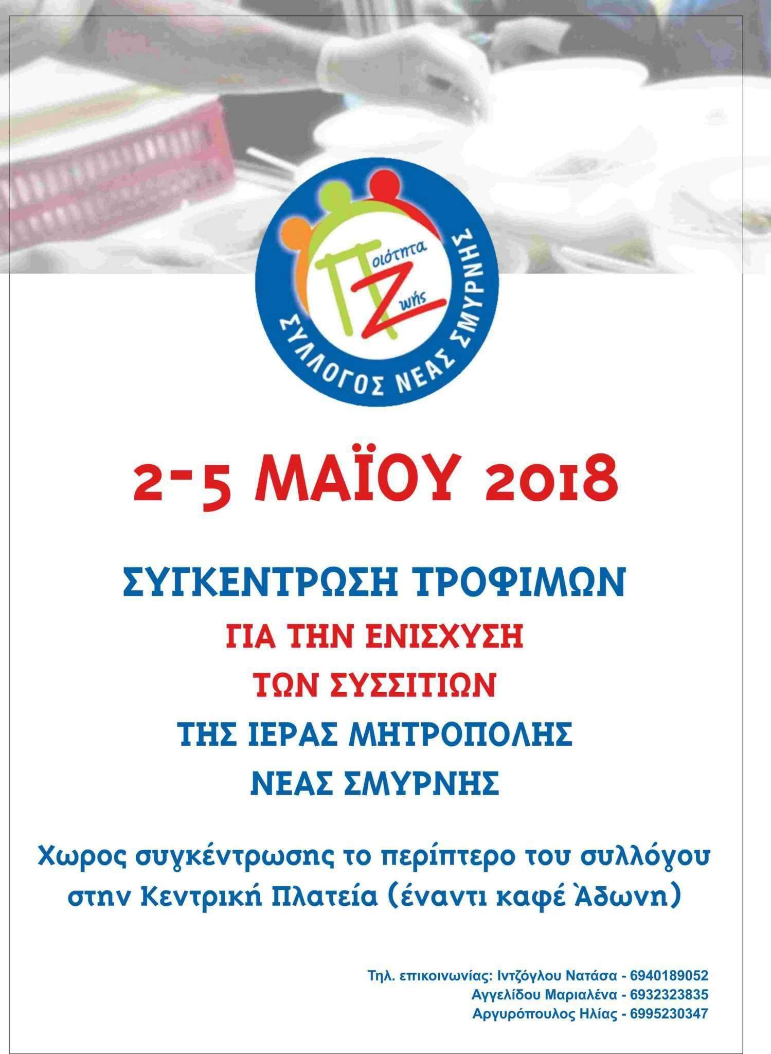 Απο 2/5/2018 στην κεντρική πλατεία Ν. Σμύρνης συλλέγουμε τρόφιμα για τα συσσίτια συμπολιτών μας που θα διατεθούν μέσω της Ι. Μητρόπολης Ν. Σμύρνης!