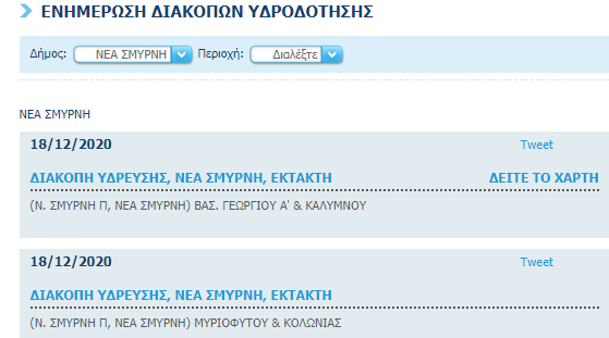 Σήμερα αντίστοιχα η ΕΥΔΑΠ ανακοίνωσε διακοπές νερού στις οδούς Βασ.Γεωργίου Α και Καλύμνου αλλά και στις οδούς Μυριοφύτου και Κολώνιας