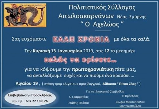 Tην Κυριακή 13 Ιανουαρίου κόβει την πίτα του ο Πολιτιστικός Σύλλογος Αιτωλοακαρνάνων Νέας Σμύρνης ''Ο Αχελώος''