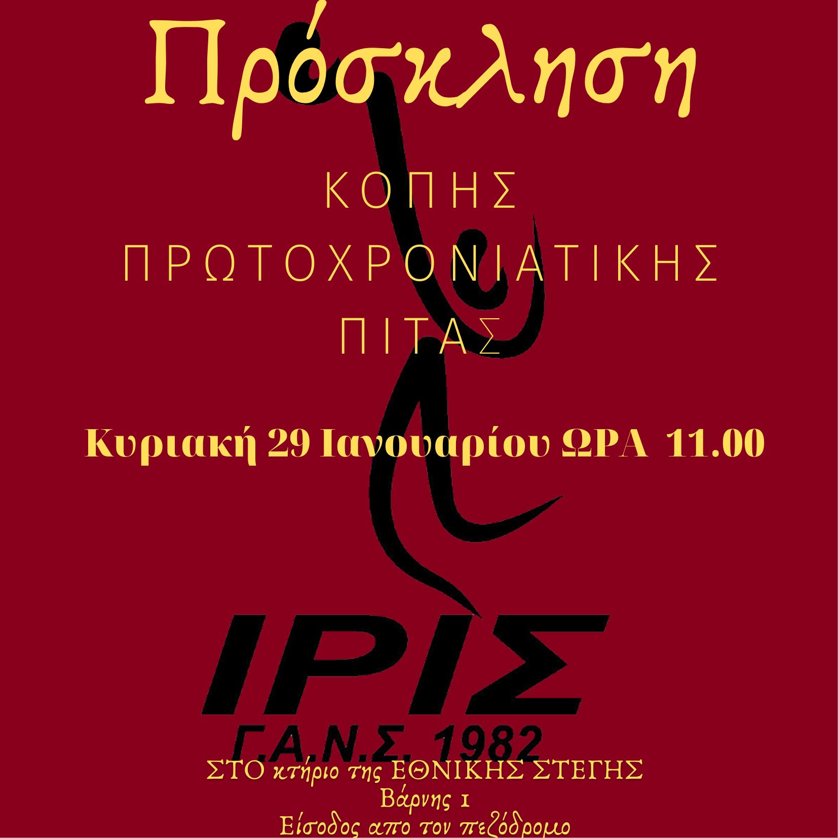 Την Πρωτοχρονιάτικη πίτα της κόβει η ομάδα της Ίριδας την Κυριακή 29 Ιανουαρίου και ώρα 11:00.