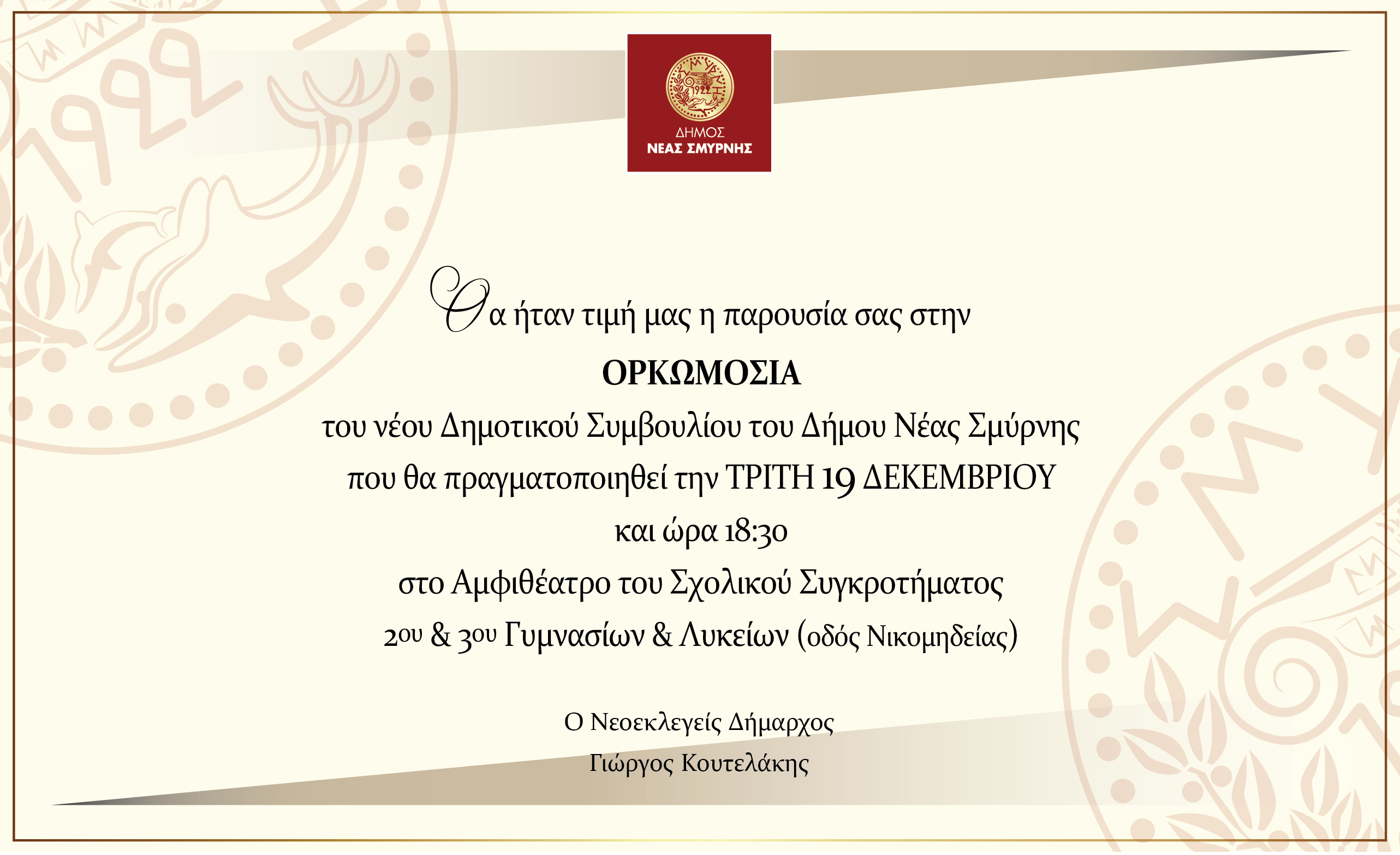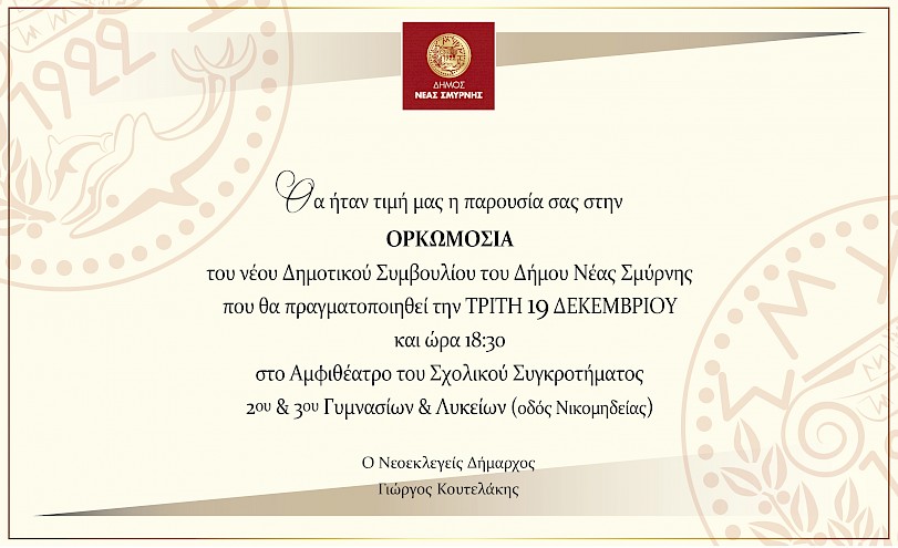 Την Τρίτη 19 Δεκεμβρίου ορκίζεται η νέα Δημοτική Αρχή του Δήμου Νέας Σμύρνης