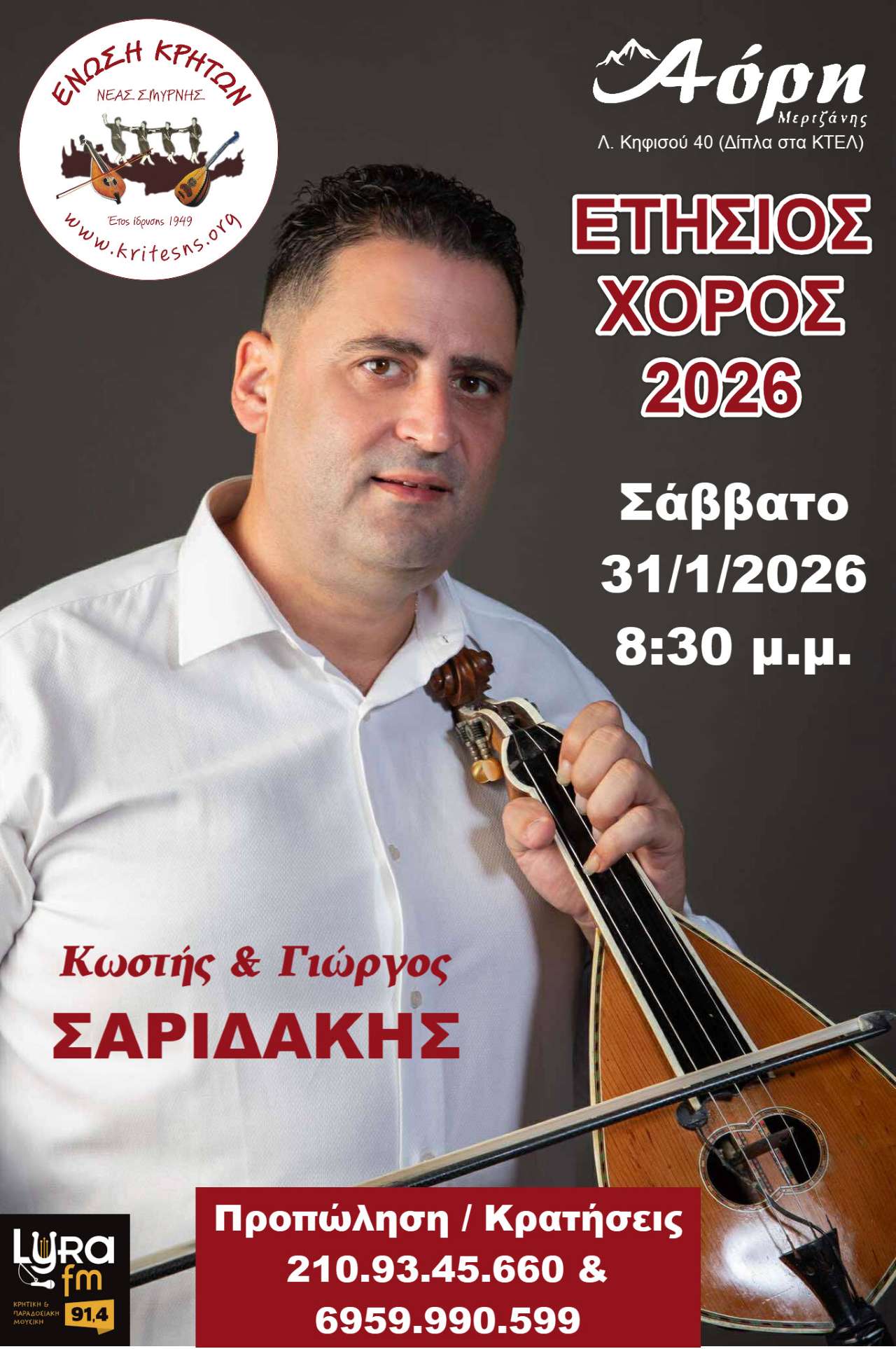 Το Σάβατο 31 Ιανουαρίου θα πραγματοποιηθεί ο Ετήσιος Χορός 2026 της Ένωσης Κρητών στο κέντρο "Αόρη Μερτζάνης" (Λ. Κηφισού 40) στις 20:30 με τους Κωστή και Γιώργο Σαριδάκη.