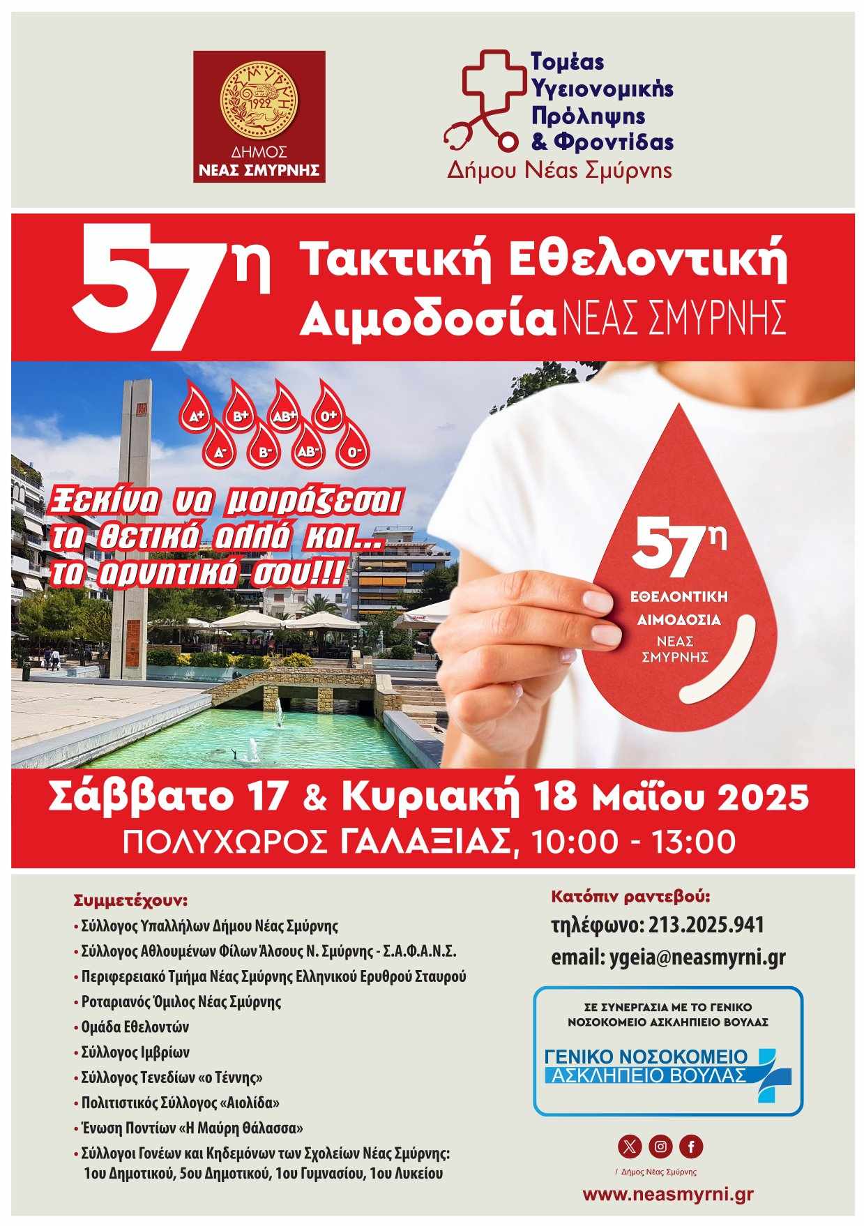 Ο Δήμος Νέας Σμύρνης σε συνεργασία με το Γενικό Νοσοκομείο Ασκληπιείο Βούλας, διοργανώνουν την 57η Τακτική Εθελοντική Αιμοδοσία για την ενίσχυση της Δημοτικής Δανειστικής Τράπεζας Αίματος.