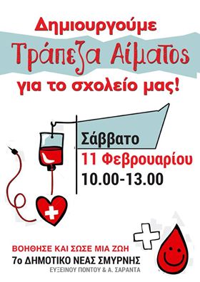 Βοήθησε και εσύ μιά ζωή. Δώσε και εσύ αίμα στην Τράπεζα αίματος του 7ου Δημοτικού Νέας Σμύρνης