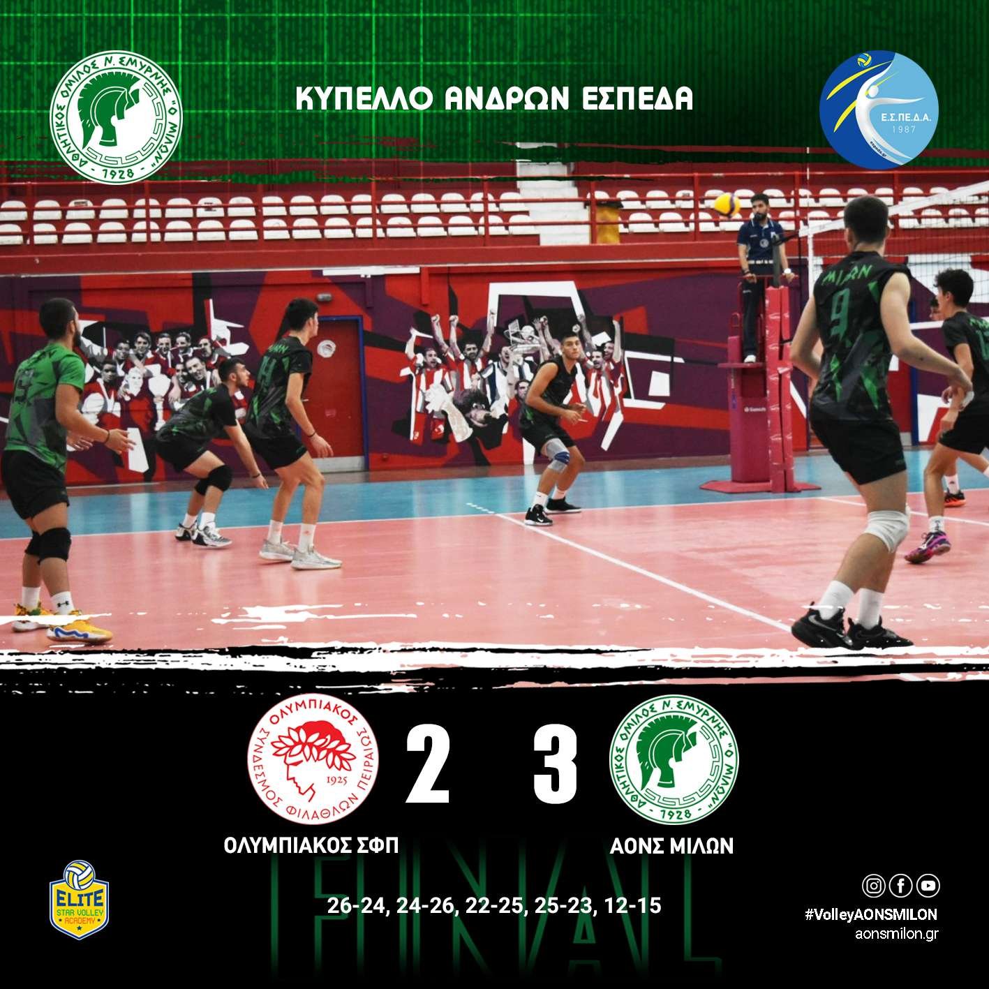 Μια πολύ μεγάλη νίκη-πρόκριση πήρε η εφηβική ομάδα βόλεϊ του Μίλωνα επί του Ολυμπιακού στο Κύπελλο Ανδρών ΕΣΠΕΔΑ. Η ομάδα του Παναγιώτη Γεωργούντζου επιβλήθηκε με 3-2 των "ερυθρολεύκων" εκτός έδρας και πήρε το εισιτήριο για την επόμενη φάση της διοργάνωσης.