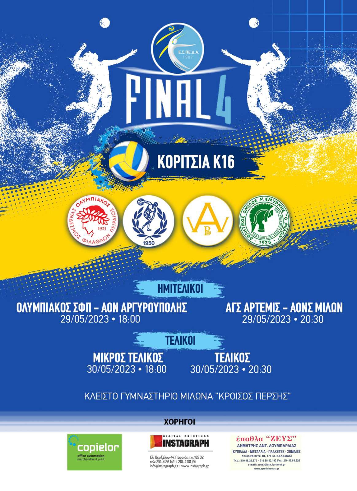 Στο κλειστό γήπεδο του Μίλωνα «Κροίσος Πέρσης» θα διεξαχθεί το final-4 των Κοριτσιών Κ16 της ΕΣΠΕΔΑ με τη συμμετοχή του Ολυμπιακού, της Αργυρούπολης, της Άρτεμις Κορυδαλλού και του Μίλωνα.