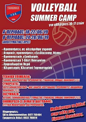 Αυτό το καλοκαίρι, ο Πανιώνιος διοργανώνει camp για αθλήτριες βόλεϊ 10-17 ετών. Το camp αυτό θα διεξαχθεί σε δύο περιόδους, από 18-22/6 και από 24-28/6. Την τεχνική επιμέλεια θα έχει ο προπονητής της γυναικείας ομάδας βόλεί του Ιστορικού, Γιάννης Μακρόπουλος, με συνεργάτες τους προπονητές της Ακαδημίας της ομάδας, την Εβίτα Αθανασοπούλου και τον Αλέξανδρο Κουταλάκη. Για πληροφορίες μπορείτε να καλέσετε στο 6977 755404 (Εβίτα Αθανασοπούλου), ή στο 6932 786014 (Γραμματεία βόλεϊ).