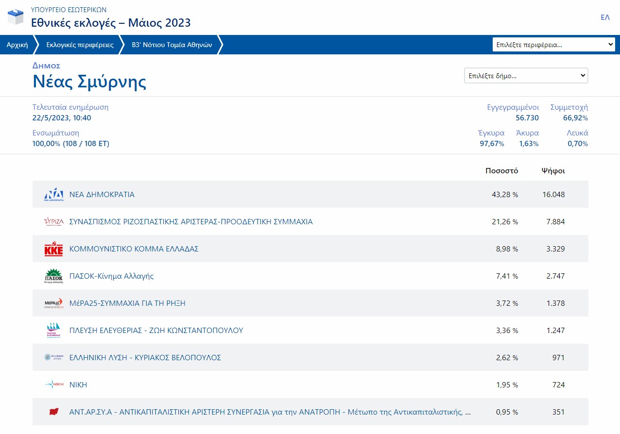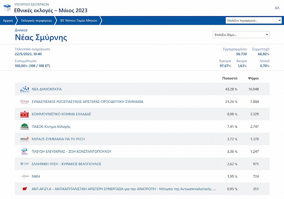 Στην Νέα Σμύρνη από τους 56.730 εγγεγραμένους συμετείχαν οι 37.964 ή 66,92%, με έγκυρα 37.081 (97,67%), Ακυρα 618 (1,63%) και Λευκά 265 (0,70%).