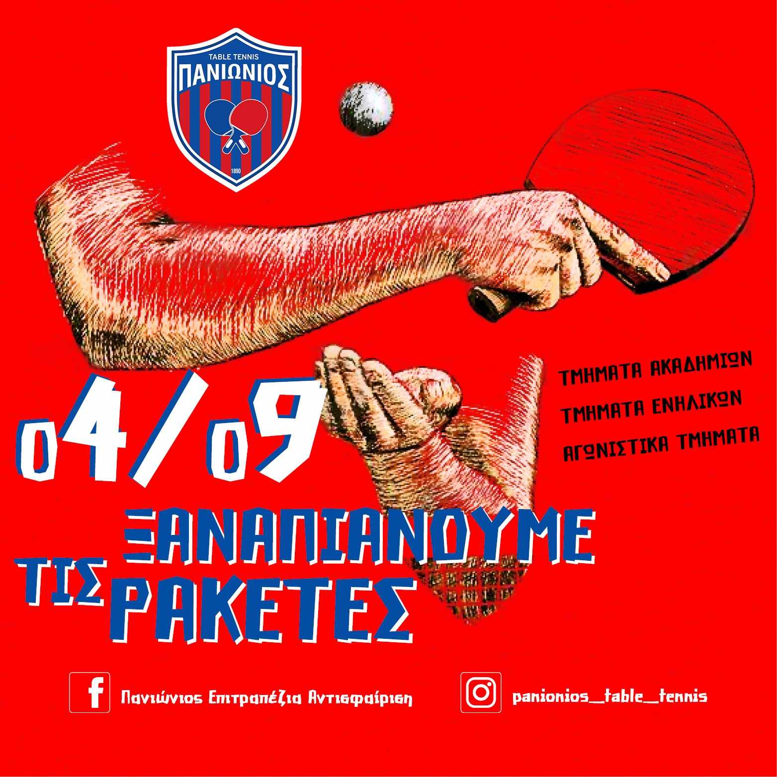 Με το σύνθημα "Ξαναπιάνουμε τις ρακέτες", το τμήμα επιτραπέζιας αντισφαίρισης του Πανιωνίου είναι έτοιμο να ανοίξει τις πόρτες του για τη σεζόν 2023-24 σε μια χρονιά ξεχωριστή μάλιστα για αυτο αφού κλείνει δέκα χρόνια λειτουργίας.