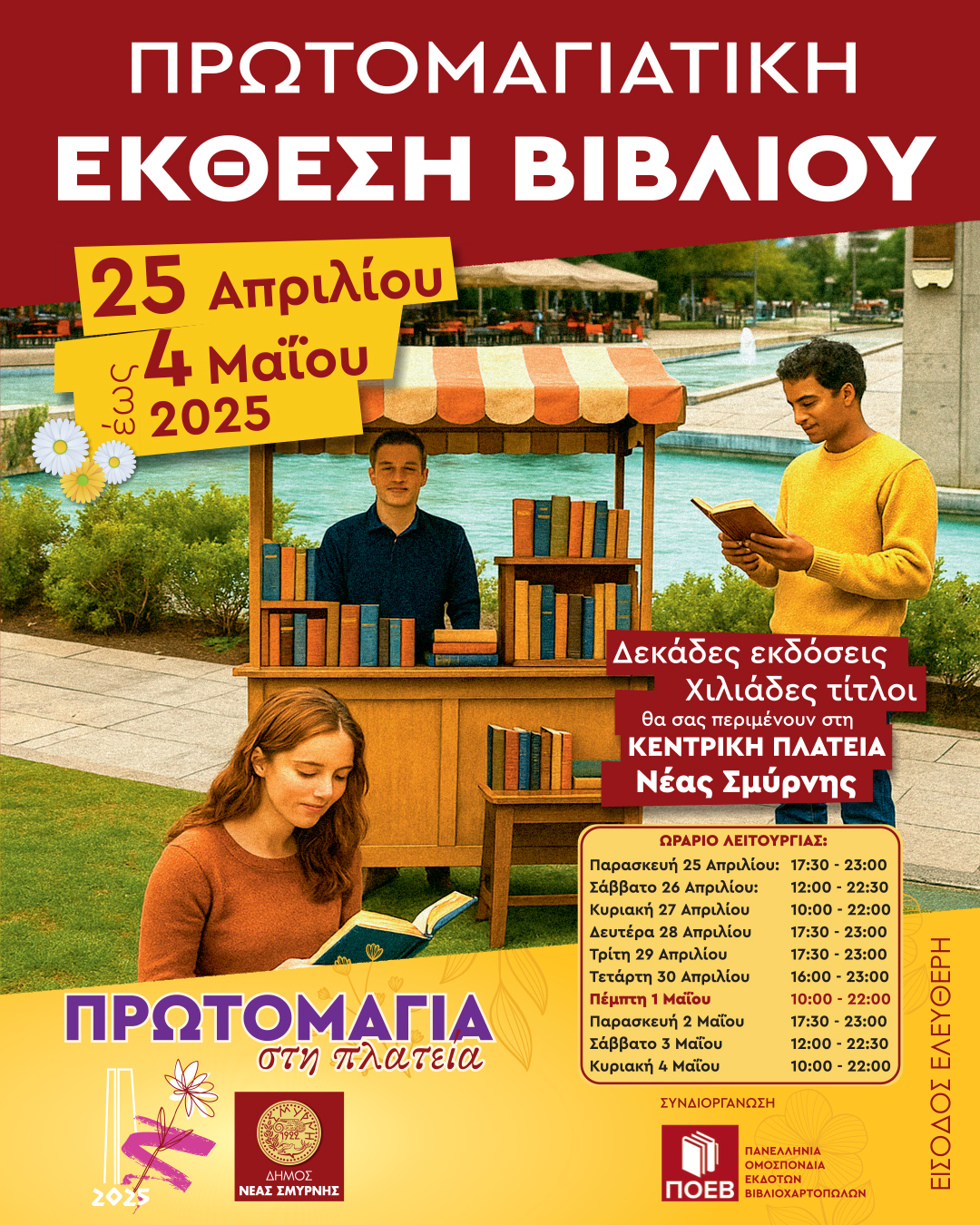 Άνοιξε σήμερα (25/4) τις πύλες της στην Κεντρική Πλατεία η Έκθεση Βιβλίου που πραγματοποιείται στο πλαίσιο των Πρωτομαγιάτικων εκδηλώσεων του Δήμου Νέας Σμύρνης. Η έκθεση θα διαρκέσει μέχρι την Κυριακή 4 Μαΐου.Οι βιβλιόφιλοι που θα κάνο