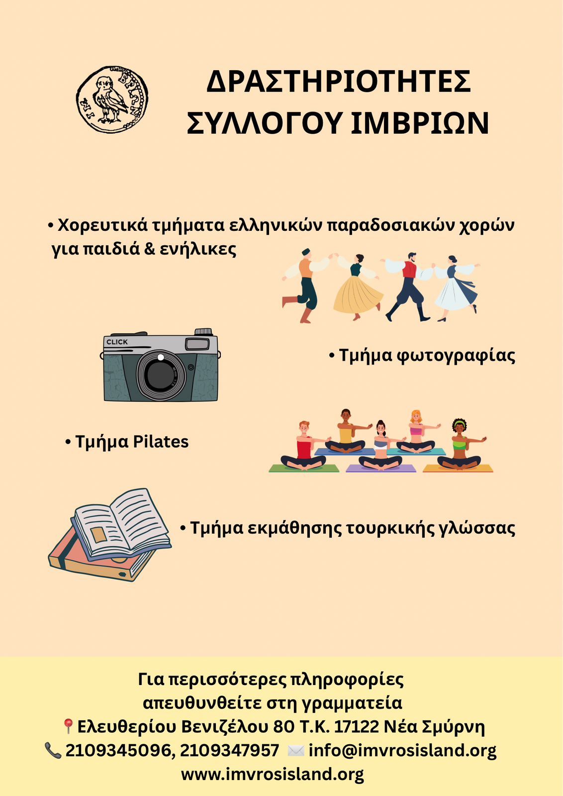 Αρχές Οκτωβρίου ξεκινούν οι δραστηριότητες στον Σύλλογο Ιμβρίων ο οποίος περιμένει τη συμμετοχή όλων όσοι ενδιαφέρονται.