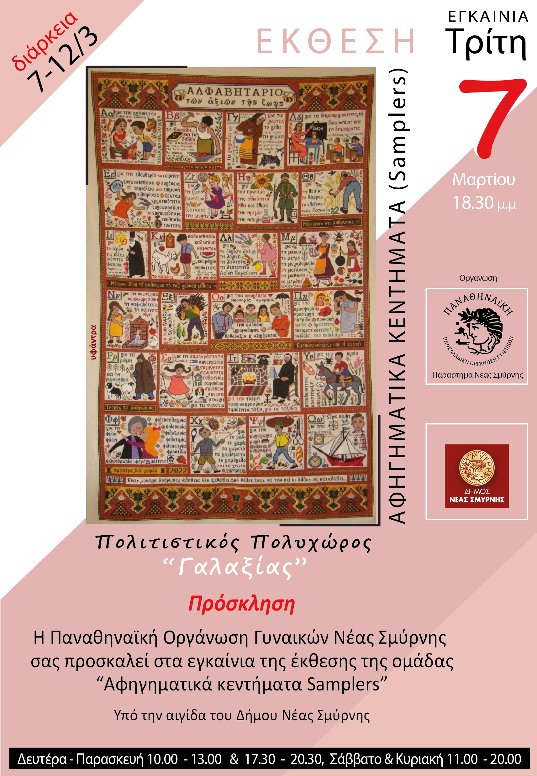 Με χαρά σας προσκαλούμε στην έκθεση "Αφηγηματικά κεντήματα samplers" που διοργανώνει η Παναθηναϊκή Οργάνωση Γυναικών, από τις 7 ως τις 12 Μαρτίου, στον Πολιτιστικό Πολυχώρο "Γαλαξίας".