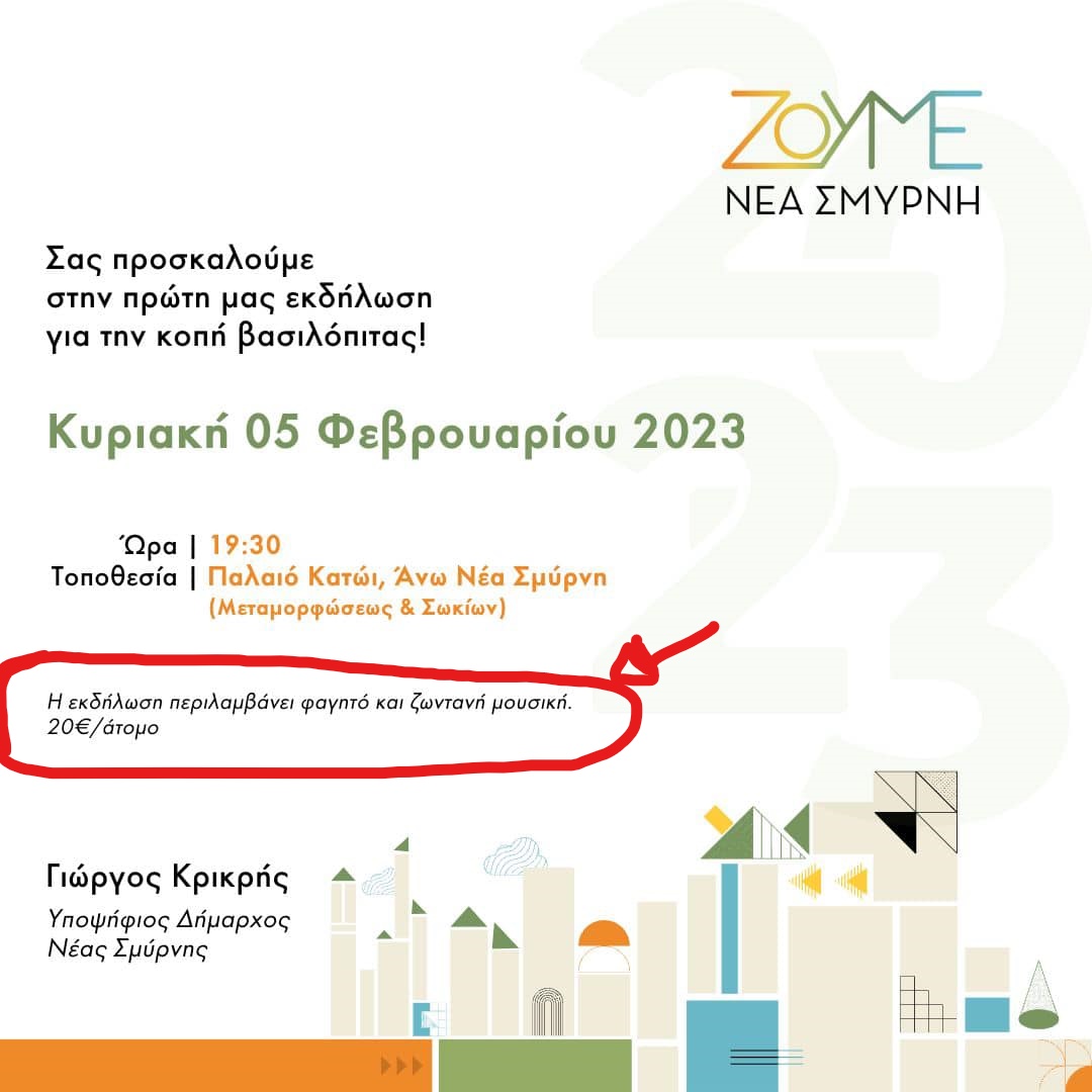Ο υποψήφιος δήμαρχος Γιώργος Κρικρής σε καλεί στην πρωτοχρονιάτικη πίτα για να ανταλλάξετε ιδεές όπως γράφει στην ανακοίνωση στα κοινωνικά δίκτυα με κόστος 20€!